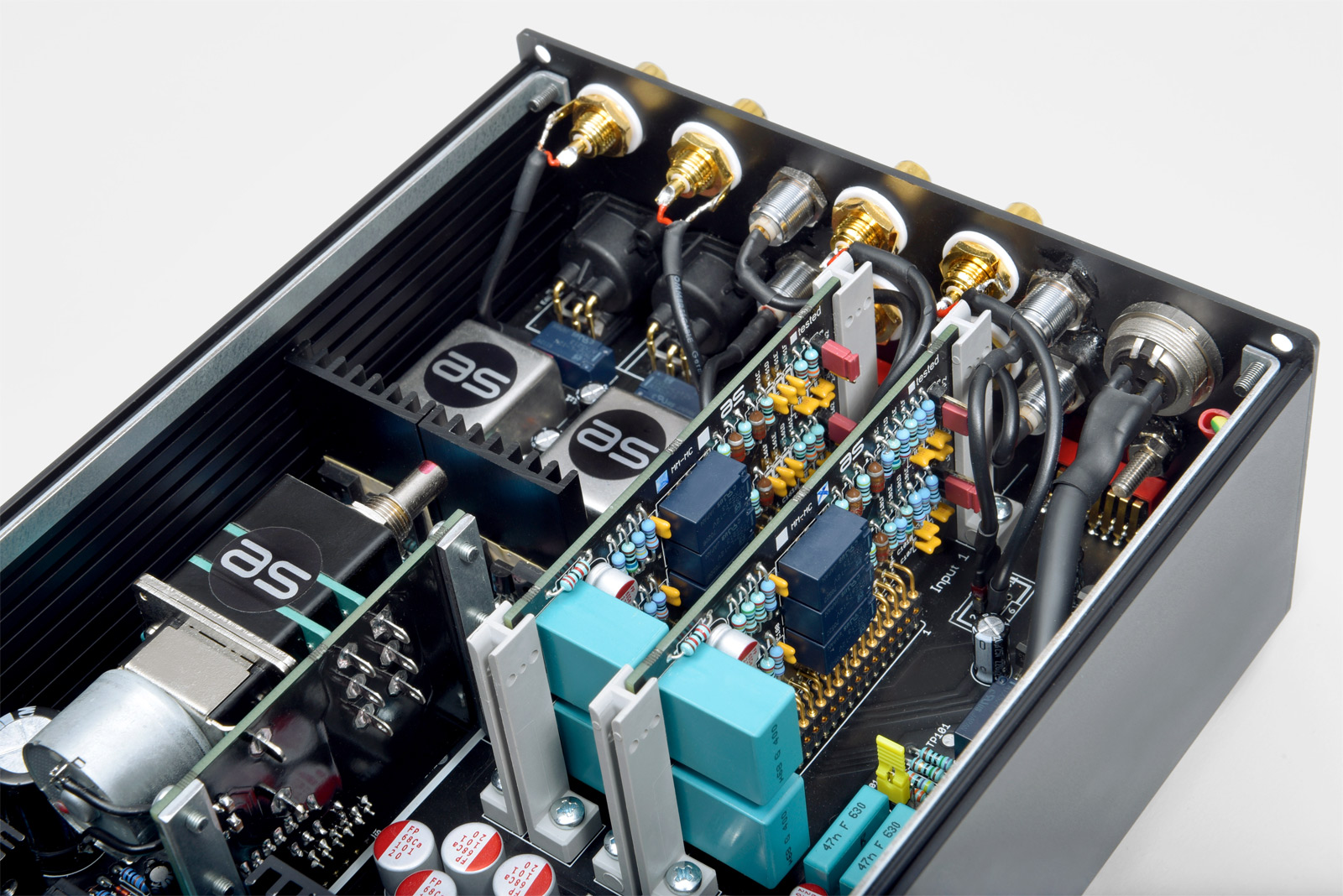 Das bietet die PSU 1.2 mit über 60.000 µF Kapazität und einem mit zweifachem MU-Blech geschirmten und vergossenen Ringkerntrafo. Je nach Platzbedarf, ist eine Geräteaufstellung neben- oder übereinander möglich.